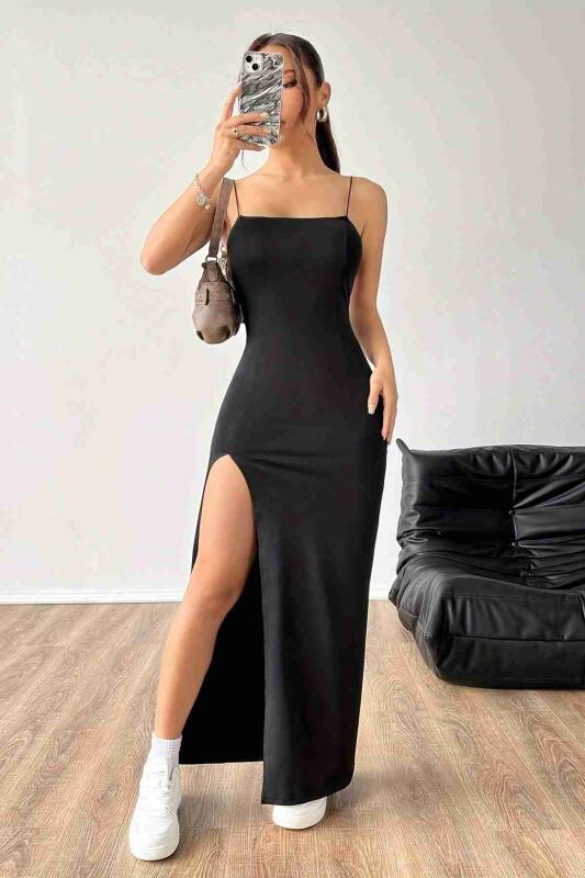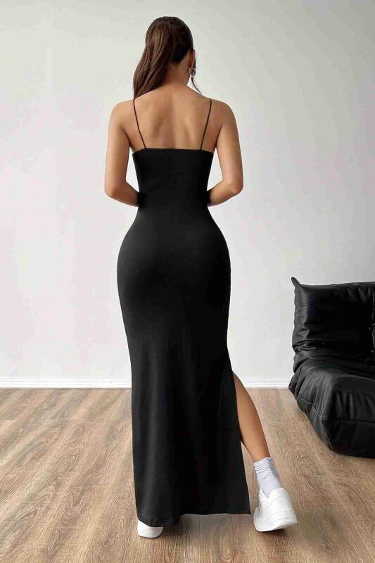 Askılı Şık Yırtmaçlı Uzun Elbise Siyah