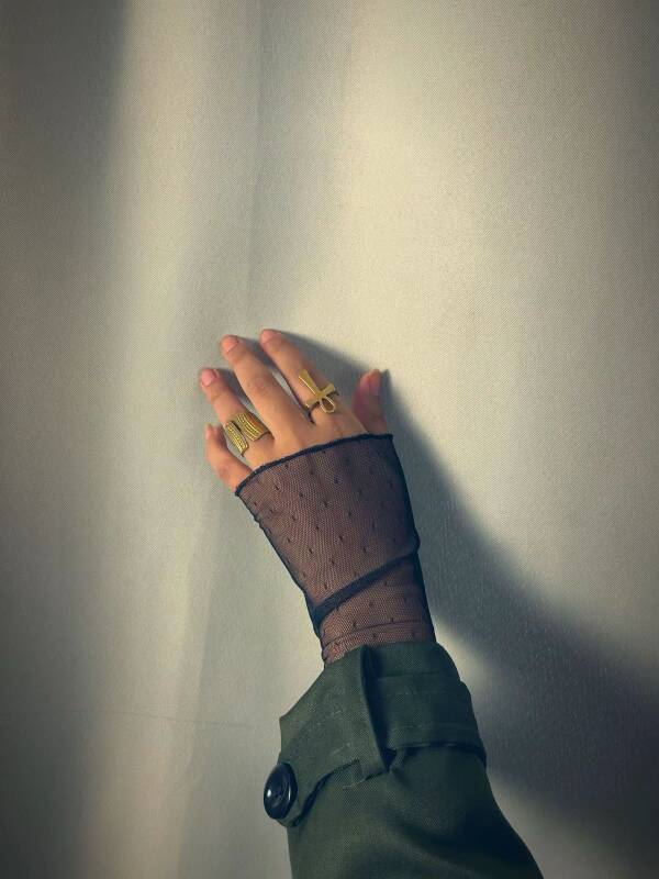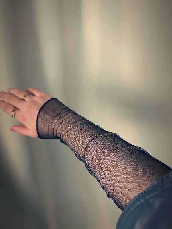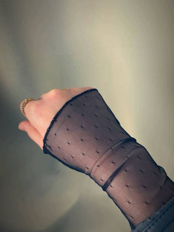 Zarif puantiye desenli, transparan tül kumaştan üretilmiş çift eldiven seti. Sağ ve sol el için takım olarak gönderilir. Hafif ve esnek yapısı sayesinde eli ve bileği rahatça sarar, konforlu kullanım sunar. Özel günlerde, davetlerde, çekimlerde ve şık kombinlerde feminen ve modern bir dokunuş katar. Minimal tasarımı sayesinde elbise, abiye ve bluzlarla kolayca kombinlenebilir.